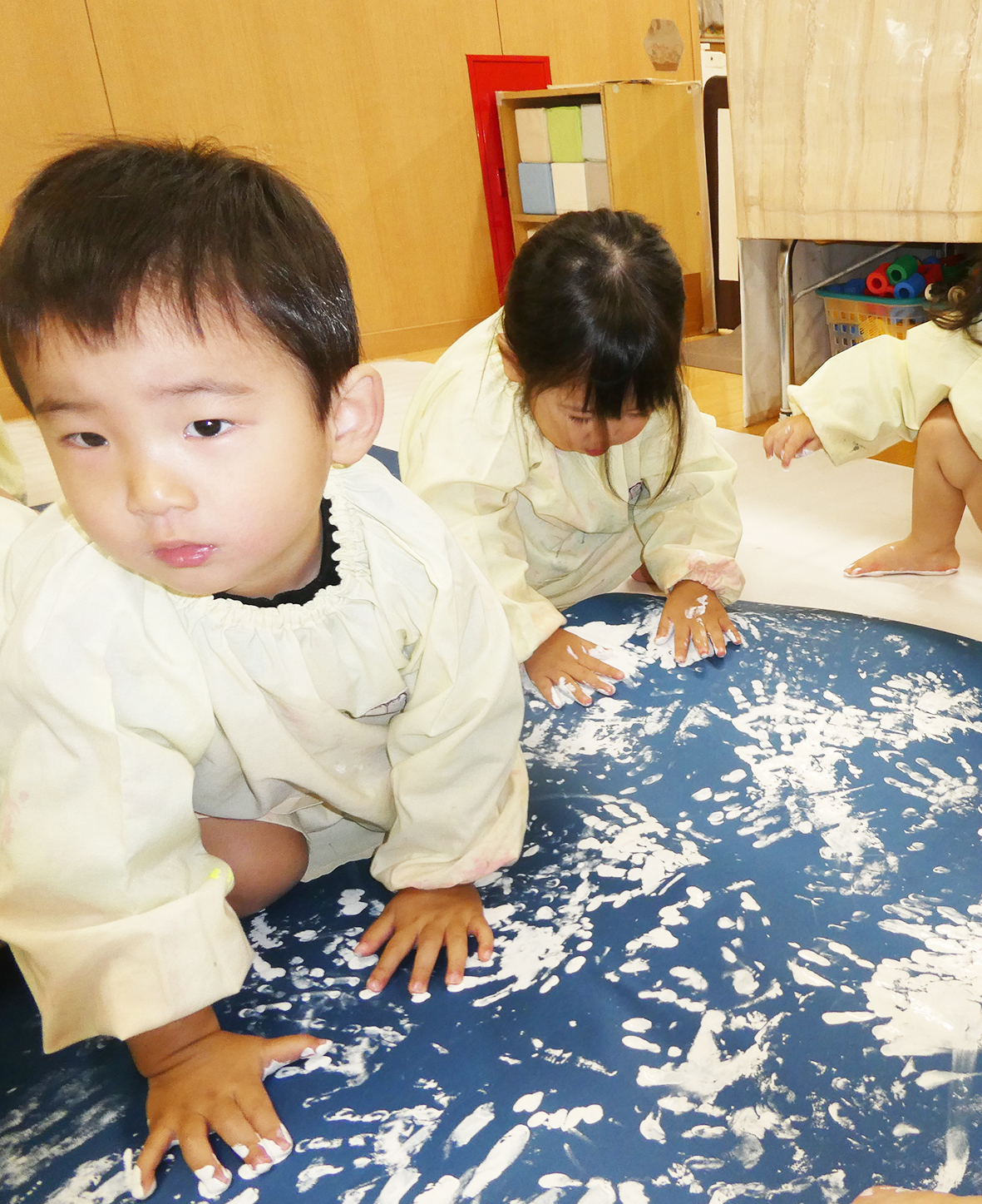 絵具を使ってみんなで一つの作品を作りました。今回は雪だるまを作りました!大きな模造紙を用意し、手や足に絵具を付けて、ペタペタと思い思いに色を付けました。可愛い手形や足形が模造紙について、とても可愛かったです♡また、絵具が入った容器をお友だちと一緒に使ったりお話ししながら楽しんだりする姿があり、とても成長を感じました。子ども同士での関わる姿に寄り添いながら、保育者が仲立ちとなり、お友だちとの関わりを楽しめるようにしていきたいと思います。