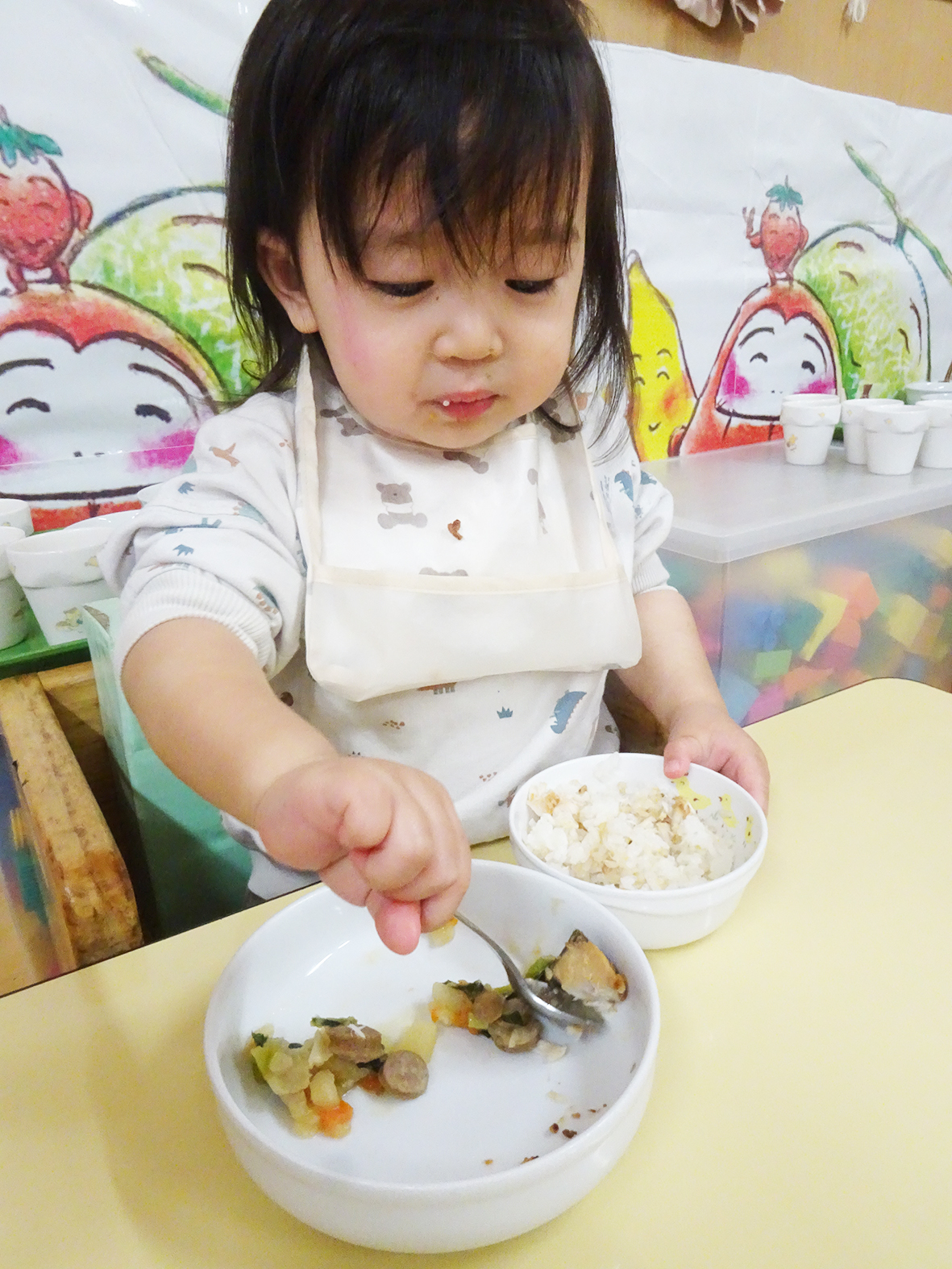 また、あひる組の子どもたちはご飯の時間が大好きです。保育者がご飯の準備を始めると、「今日のご飯何?」と聞きに来る子もいます。最近は、スプーンを上手に使うことが出来るようになり、食べこぼしも減ってきました。また、上手持ちから下手持ちで食べることが出来るようになった子や左手でお皿を持って食べることが出来るようになった子もいます。苦手な食べ物も少しずつ食べられるようになり、残す事が少なくなりました。引き続き、楽しく食事が出来るようにしていきたいとおもいます。