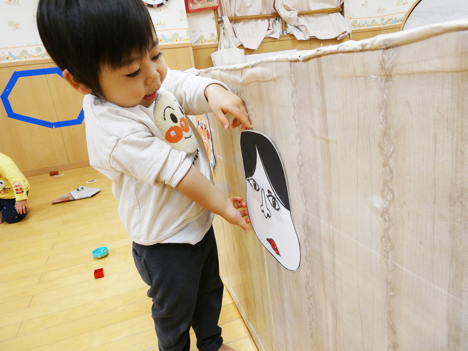 完成した顔が、口が斜めになっていたり、鼻が頭の上にあり、ちょっぴり不思議な表情になると、子どもたちは指をさして笑ったり、「おかしいね」と言葉を交わしながら、福笑いならではの愉快な雰囲気を楽しみました。