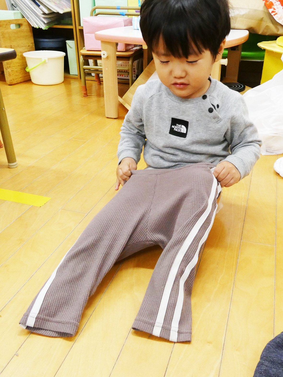 2歳児クラスへの進級に向けて、ズボンや靴下など自分で履いたり脱いだりが出来るように少しずつ練習をしています。自分でしようとする意欲を受け止めながら、介助をしていきます。ご家庭でもお休みの日や時間のある時は、自分で出来るように見守って頂けると嬉しいです。進級に向け、自分で出来る経験を増やし、子どもたちのこれからの自信に繋げていきたいと思います。
