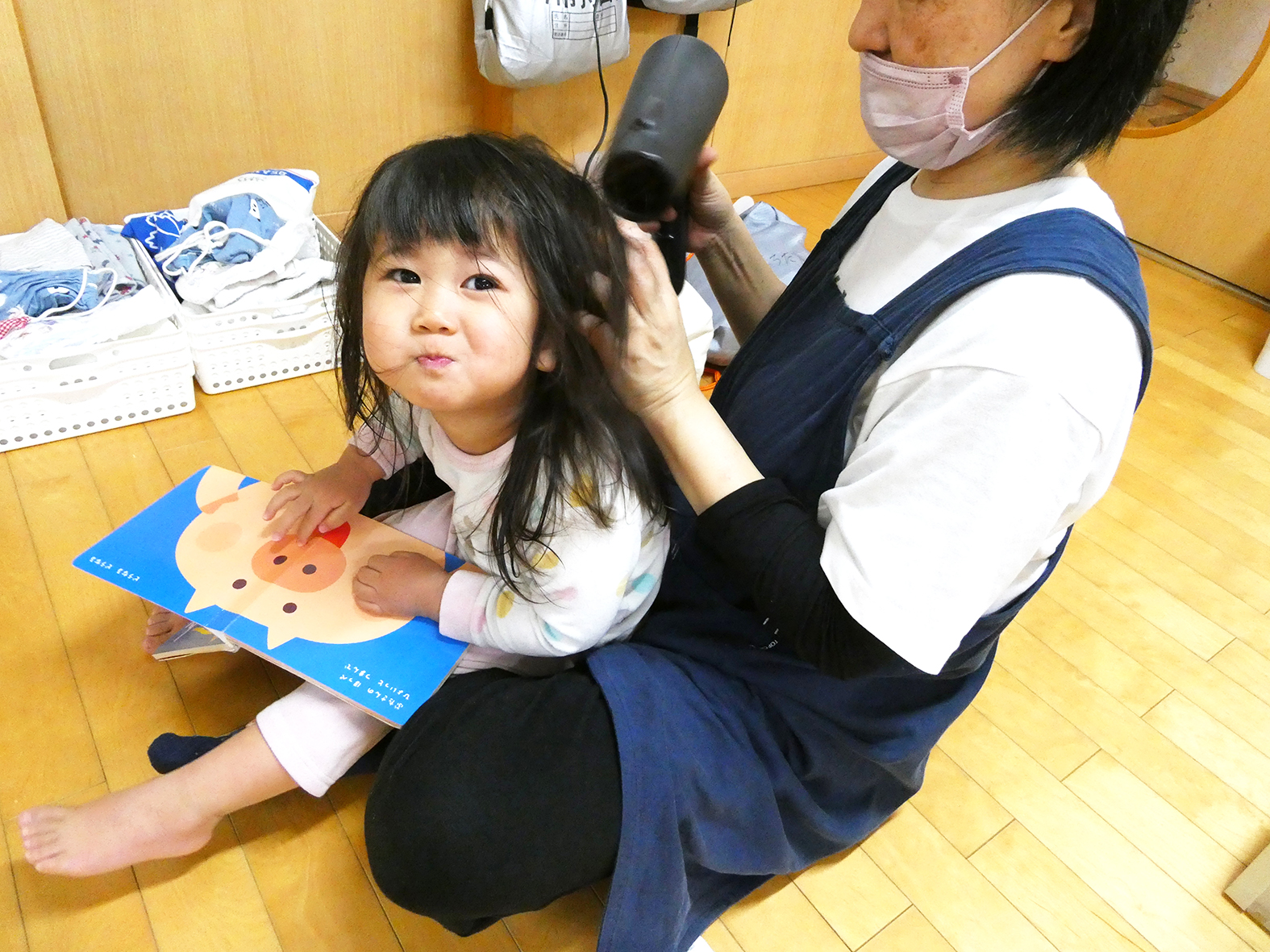 今月はあひる組のお泊まりの様子をお伝えします。夕食を終えると、大好きなお風呂の時間が始まります!検温を済ませ、保育者と一対一で順番にお風呂に入ります。「脱ぎ脱ぎしよう!」などと声を掛けると、やる気満々に取り組む子どもたち。最近では身体を自分で洗う!!と進んで挑戦する姿も見られます。湯船に浸かりながら水面を叩いてバシャバシャ上がる水しぶきにアハハ!と喜んだり、水車やぞうさんのじょうろで流れる不思議を観察したりと、子ども一人ひとりがお風呂の時間を楽しんでいます。またドライヤーで髪の毛を乾かす際には、お気に入りの絵本を選び、保育者の膝の上に座り、おしゃべりを楽しみながら乾かしています♪