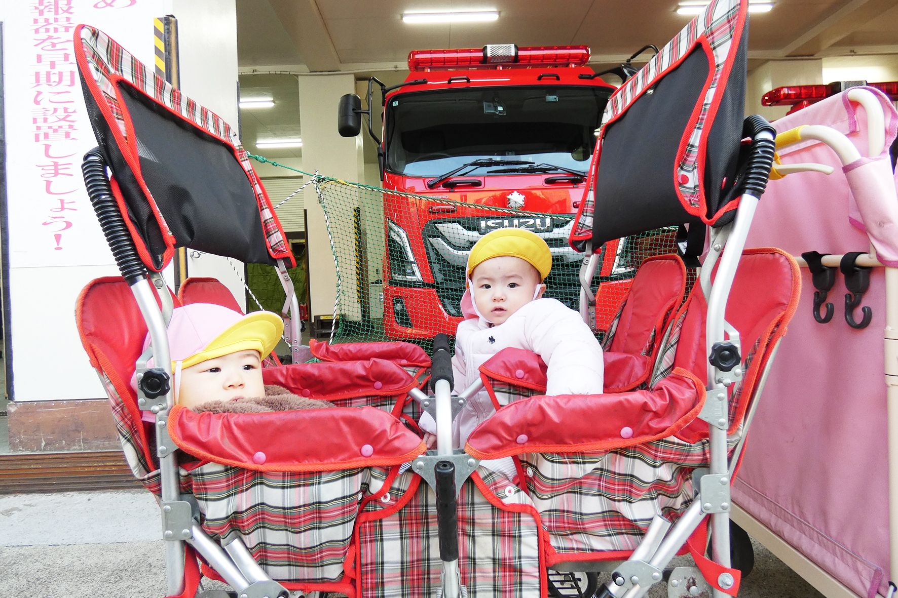 お散歩が大好きな子どもたちは準備の時からとっても嬉しそうで、「今日はどこに行くのかな?」「大好きな消防車を見られるかな?」など色々想像してワクワクしているお顔をしています。最近は人数が増えたので、お散歩車とバギーの2台でお散歩に行きます。歩ける子は手を繋いで一緒に歩いて行き、疲れたら交代をしてお散歩車に乗っています。お散歩はきりん公園や消防署見学、熱帯魚の水槽がある動物病院に立ち寄ることが多いです。地域の方々にも沢山手を振っていただいたり、犬の散歩中の方が立ち止まって犬をゆっくり見せてくださったりと優しく見守っていただきながら温かい気持ちに感謝をし、お散歩を楽しんでいます。