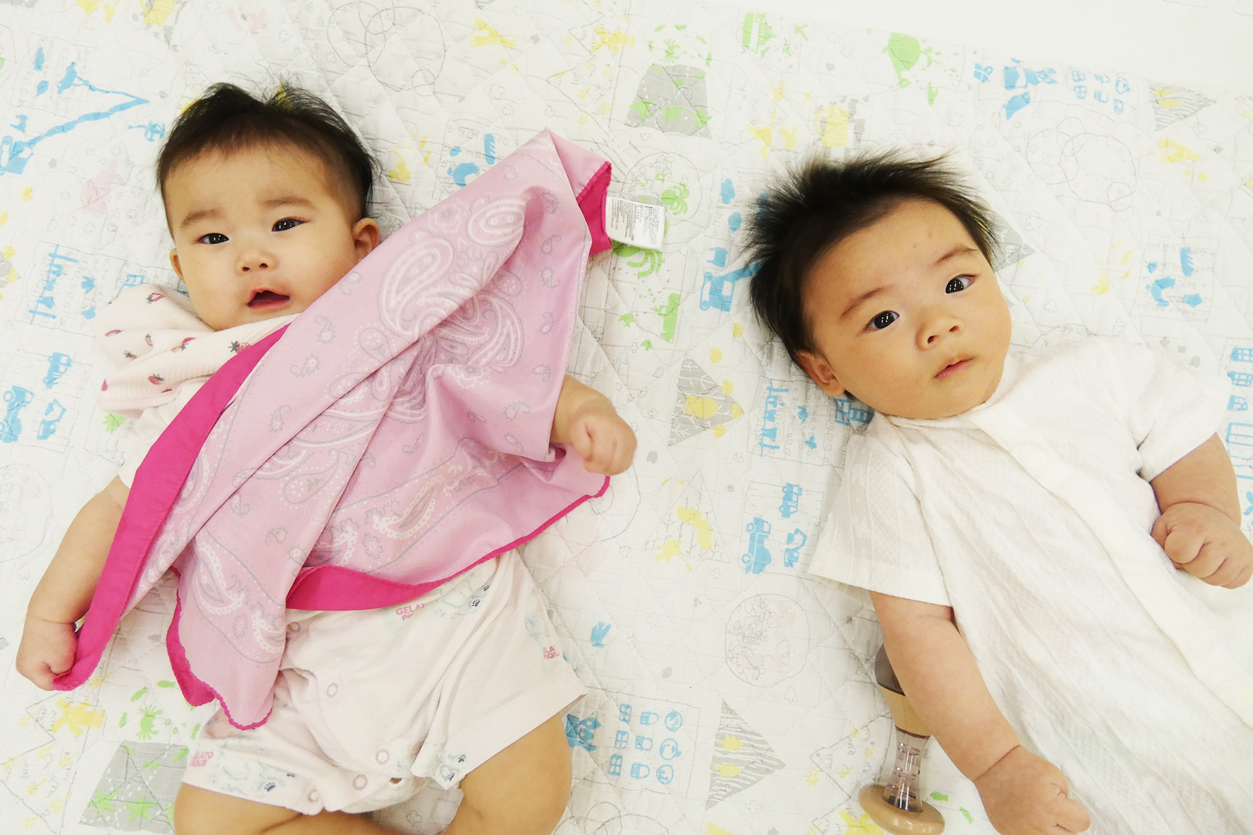 ひよこ組の高月齢の子どもたちの間では、乗り物の絵本が大流行です!絵本をめくって「パトカー!」「しょうぼうしゃ~」など指差しをしながら大きな声で覚えた車を得意気に教えてくれます。そして、「ガガガガガ~」「ピーポーピーポー」など車の音も真似をして楽しんだりもしています。そんな中、ふとねんねをしている低月齢の子どもの事を思い出し、頭をナデナデしたり、おもちゃを持って渡したりと、お世話をしてくれる姿もあります。やっと寝返りができるようになった子も、嬉しくて手足をバタバタ動かしてニコニコして喜んでいます。抱っこをして欲しい時には一生懸命、首を上に持ちあげてアピールをしてくれる姿がとても可愛いです。優しくてとても仲よしな子どもたちです。