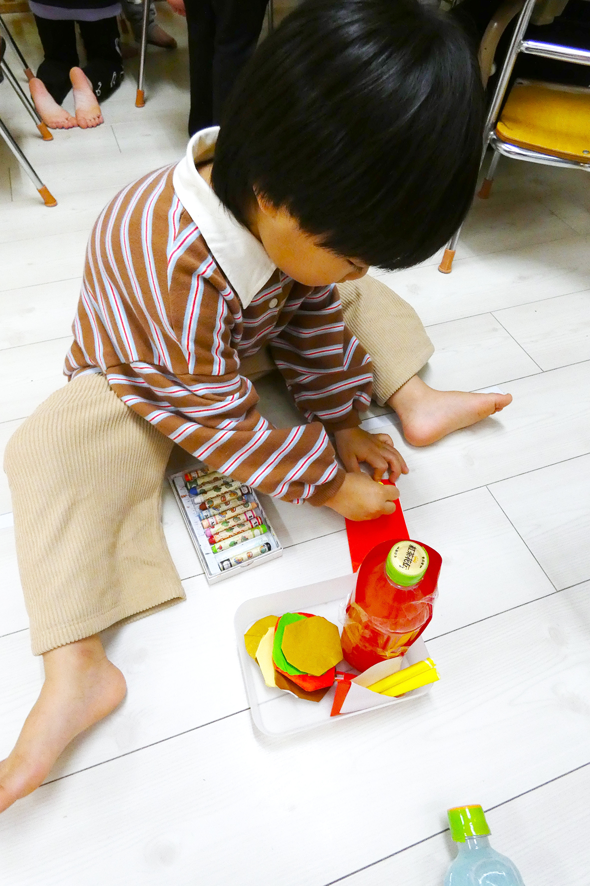 少し前からハンバーガー屋さんでもらえるおもちゃについて、子どもたちと話が弾むことが多く、それをきっかけに折り紙を使って、ハンバーガーを作ると、あっという間にハンバーガー屋さんごっこが始まりました。子どもたちは次々と「ポテトも!」「ナゲットも!」と言って作り、どんどん種類が増えていきました。今ではサイドメニューやドリンクも増え、セットが作れるほどにまでなり「いらっしゃいませ~」「〇〇でーす」と店員になりきって、遊ぶ姿が見られています。アイディアが広がる子どもたちに合わせて一緒に作ったり考えたりしていくのは、とても楽しいです。今後も子どもたちとの会話を楽しみながら、子どもが想像したものが形になる喜びを感じられるようにしていきたいと思います。