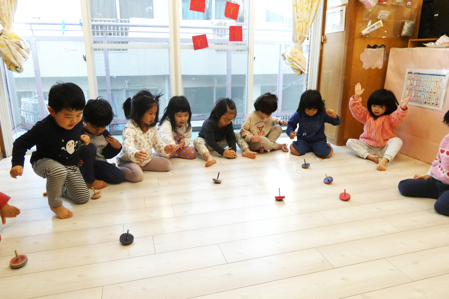 コマ遊びも慣れてきたところで、コマ大会を行いました!保育者の「よーい、どん!」の掛け声で一斉にコマを回し、誰のコマがいちばん長く回り続けられるか競いました。自分のコマが止まらないことを願うようにじっと見つめる姿はとても可愛かったです♡自分のコマが止まった後は、回り続けている友だちのコマに「がんばーれ!がんばーれ!」と大声で応援するりす組の子どもたち、息がぴったりでした♪