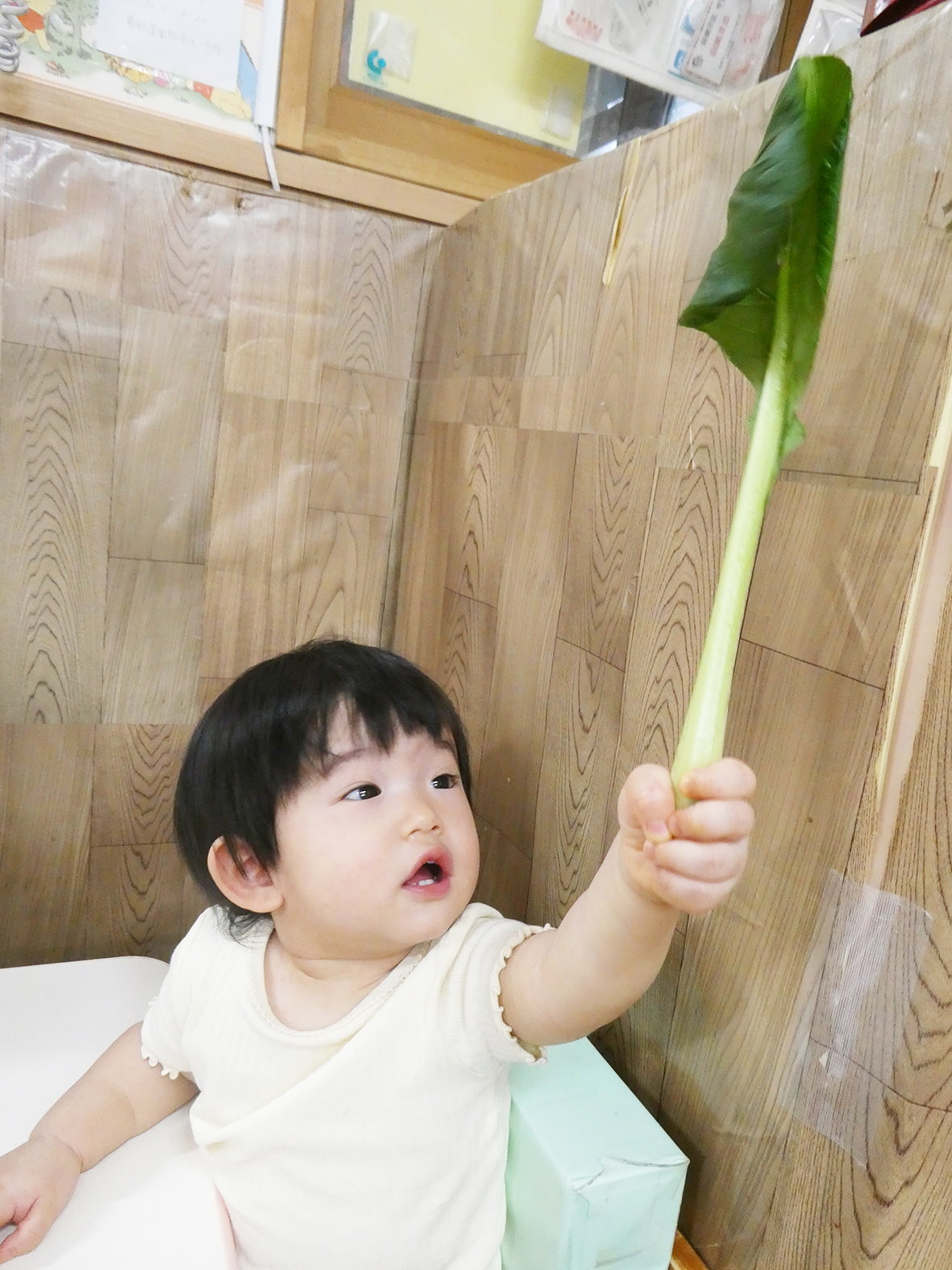 「土の良い匂いがするね」と順番に野菜に顔を近づけて匂いを嗅いでみます。断面を見せると、不思議そうに中身をつつき種をほじくる様子も。やがて、ばらばらになった小松菜を一本握り、元気よく振ってみたりと、笑顔を見せて楽しんでいました。初めての食育を通して、野菜に興味を持つ姿があり、大成功でした。また機会があれば旬の野菜に触れたいと思います。