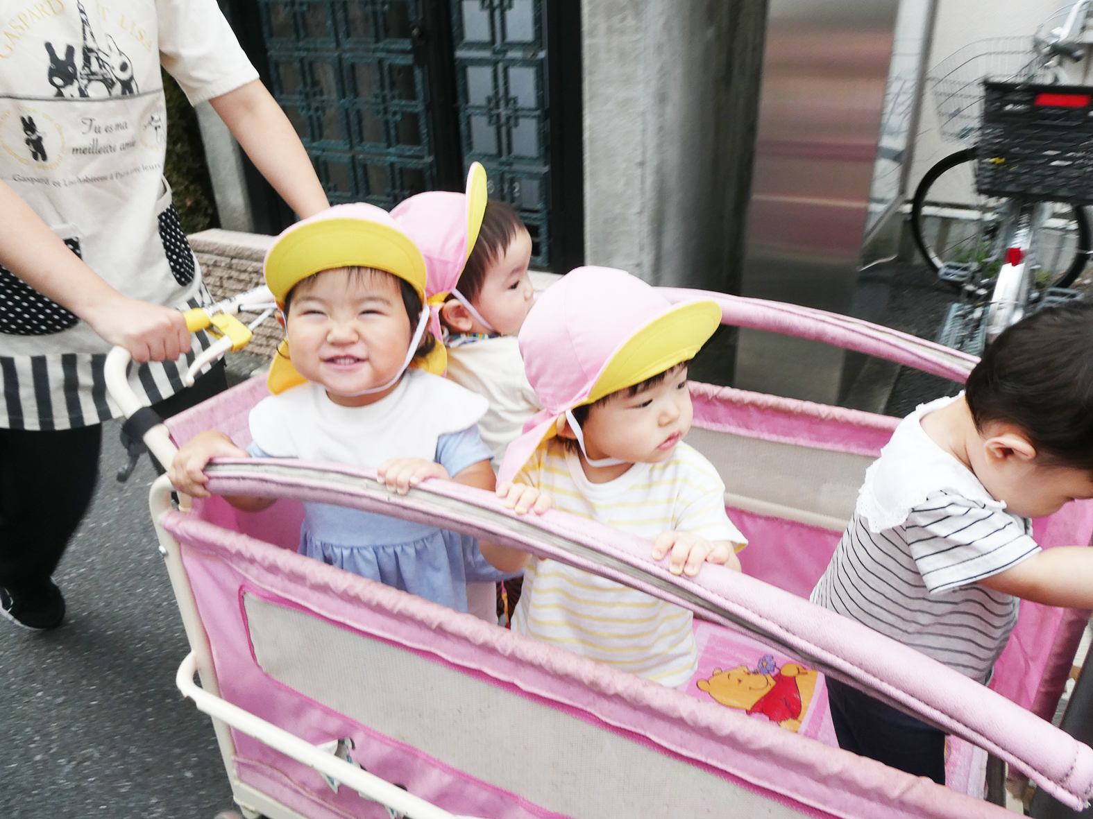 たまご組では、涼しくなった事もあり、できる限りお散歩に向かう機会を多く設けています。公園に向かうのは、最近ではお散歩車を使用して移動しています。お外が良く見えるので、周りの環境にみんな興味津々で、背伸びをして観察をしています。立って、掴み、バランスを取るのが難しいのですが、みんなとても上手になりました。すれ違う人には、なんども「バイバイ!」と言いながら手を振って、ワンちゃんを見つけると「わんわん!」とその場で嬉しそうにぴょんぴょんとジャンプして喜びを伝えてくれます。お散歩車に乗るだけではなく、靴を履いて歩く練習も行うようにしています。保育者が両手をしっかりと握り、「いち、に、いち、に・・・」とゆっくり歩道を歩いていましたが慣れてくると力強く歩き始め、歩く事を喜び、笑顔を沢山見せてくれました。お散歩車に戻ると「あーっ」と、「もっと歩きたい!」と伝えてくれる様子がありました。子ども達にとって、見慣れた街並みのように感じても、沢山の発見の連続!これから散歩を通して、いろんな経験をしていきたいと思います。