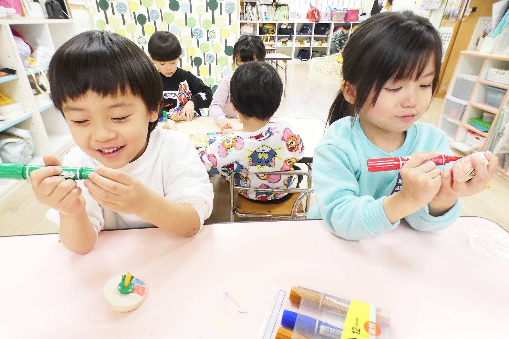 お正月遊びでは、コマで遊びました。一人一つの木のコマを渡すと「何描こうかな?」「カラフルにしようかな!」などと始まる前からとてもワクワクしている様子でした。2テーブルに分かれて、油性ペンを使ってお絵描きをしました。みんなで貸し借りをしながら仲良くペンを使って、いろいろな国旗を描いたり、ハートや丸など模様を描く子どもたち。コマの下の部分まで綺麗に色をつけて楽しんでデザインしました!完成すると、きりん組のお兄さんや保育者に紐の巻き方や回し方を聞き、コマ回しに挑戦する姿がありました。紐を巻くのに最初は苦戦している姿が見られましたが、諦めることなく何回もチャレンジして最終的には一人で巻き付けることが出来ていました。自分で描いたコマが綺麗に回すことが出来、「先生見て、回ったよ!」「やった~!」とお友だちと言い合いながら遊ぶ姿が見られました。また、お友だちと「せーの!」と言い、一緒に回して「上手にできたね」と言ったり、誰が最後まで回っているか勝負をして遊んだうさぎ組です。遊びの時間はあっという間で、「またやりたい!」と言う声がありました。自由遊びでこれからも遊んでいきたいと思います!