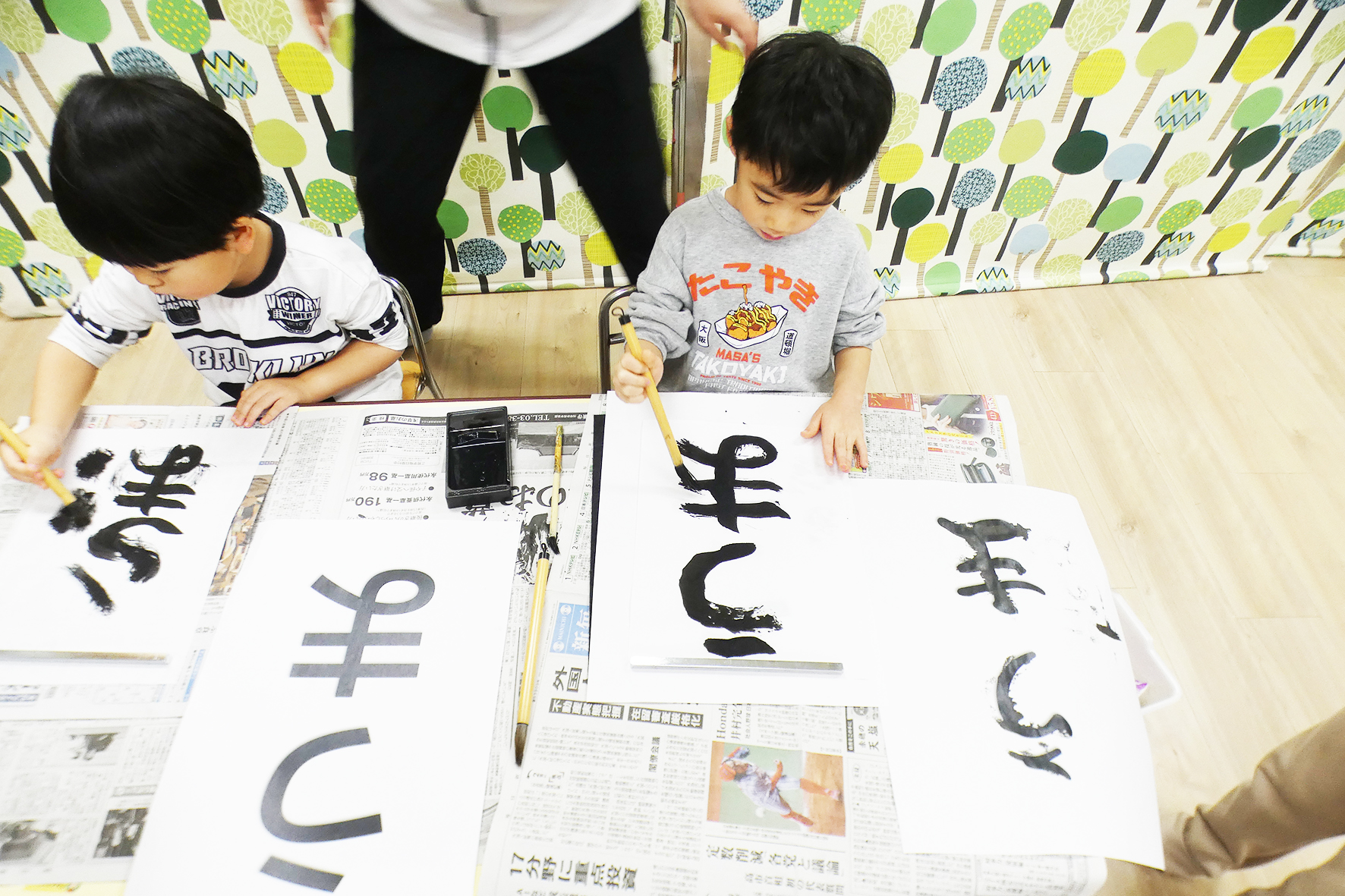 長い休みが終わり、保育園に元気に登園したうさぎ組!書き初めをしました。何を書くのか、筆や墨汁を興味津々で見ていました。 今年の干支が『うま年』なので、平仮名で『うま』と書きました。なぞり書きをしたり自分で書ける子は、お手本を見ながら書く姿が見られました。