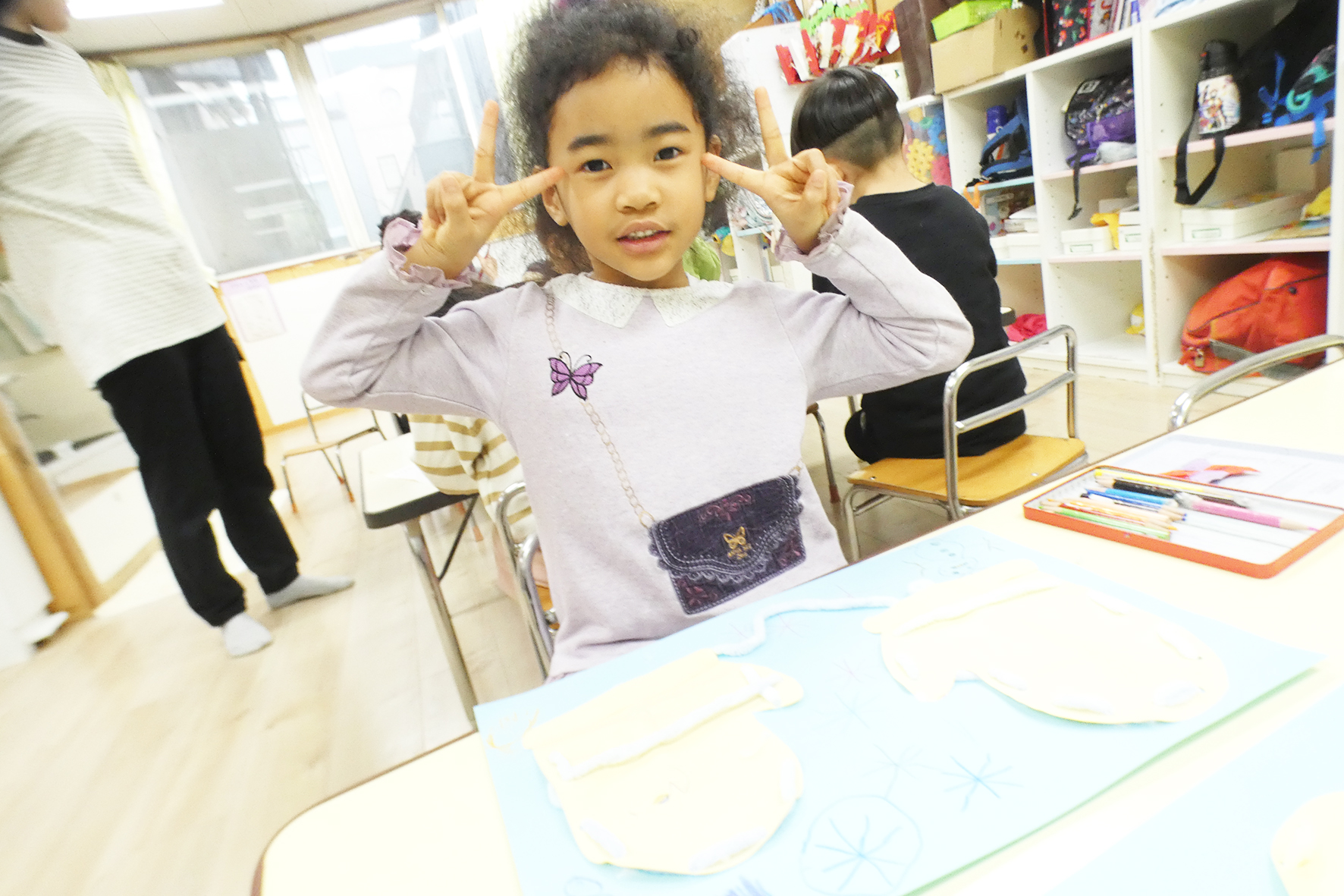 2月の貼りだす製作を作ったうさぎ組!保育者が見本を作り「これを作るよ」と伝えると「可愛い手袋」、「作りたい」と始まる前からワクワクしている姿が見られました。左右の手袋の画用紙を渡して、一人ひとり好きな色の毛糸を選んで穴に通しました。最初は少し苦戦をしていましたが、保育者と一緒にやると上達してきて、個性ある可愛い・かっこいい手袋が完成しました。手袋の紐を付けてから画用紙に貼りました。最後に『冬』をイメージしてお絵かきをしました。保育者の見て同じように「雪を描くね!」「雪は青!」「水色!」と言いながら、雪をたくさん描いてみたり、アナと雪の女王のオラフをお友だちとお話をしながら描き、楽しみながら2月の製作を完成することが出来ました。
