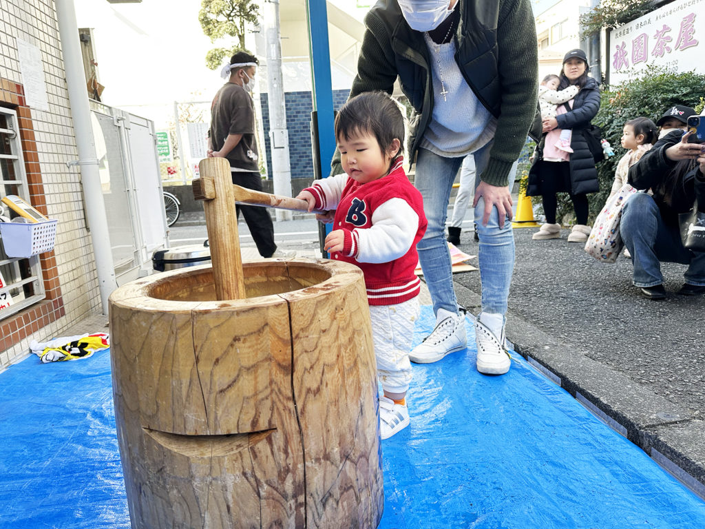 子どもたちは、朝からお父さん、お母さんと一緒に参加出来、嬉しそうな表情を見ることができました。初めてお餅つきをする子は期待と緊張の中での参加だったと思います。お父さんやお母さんと一緒にお餅をつき、安心できる環境の中で初めての行事に楽しく参加できたと思います。