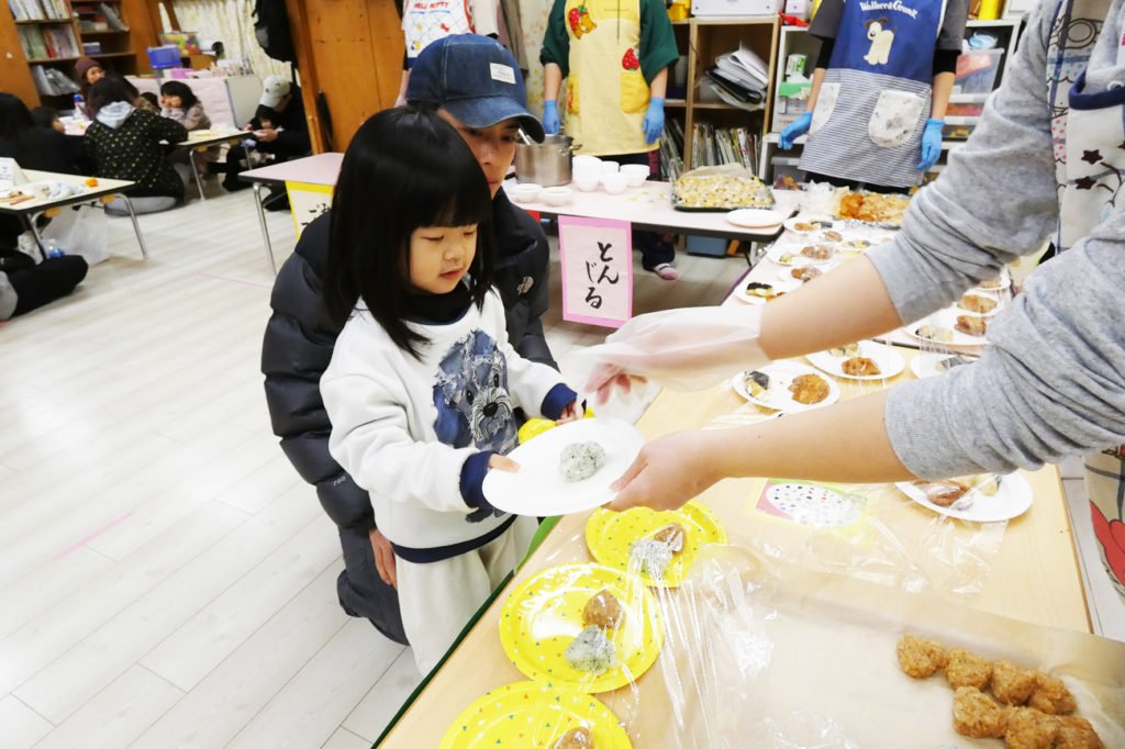 頑張ってお餅をついた後は、試食タイムです。餅の味は「きなこ・いそべ」、乳児さん用のおにぎりの味は「あおのり・きなこ」です。豚汁、みかんもありました。「運ぶのできるよ!」と普段お当番さんでやっていることをお父さんやお母さんに自慢する子、お餅が皿から落ちないようにそーっと慎重に運ぶ子、ハラハラしながらもお子さんの様子を見守ったり、お皿を両手で大量に持ち運ぶ特技を持つ保護者の方もいました。ちょっとした場面でしたが個性豊かな日常の様子を見ることができました。