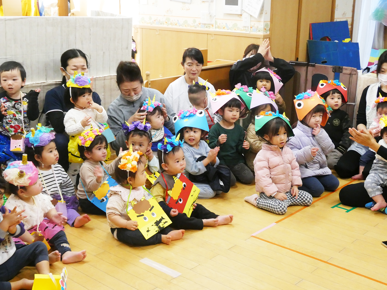 2月3日に節分の会を行いました。かわいい鬼のパンツや帽子の衣装を身にまとって気合い十分の子どもたち。まず、初めに節分の由来を説明しました。節分が2月3日である理由や豆まきをする理由など、子どもたちにとっては少し難しい内容でしたが、しっかりと保育者の話を聞いていました。「心の鬼」の説明では、「みんなの心の中に泣き虫鬼や怒りんぼ鬼、ご飯食べない鬼はいない?」と聞くと、「いなーい!」と元気に答えたり静かに首を振って答えたりと、様々な反応の子どもたちでした😊そして、製作で作ったものの紹介をし、最後に豆まきを行いました。乳児は本物の豆を使用できないので、豆に見立てたボールを使いました。段ボールで作られた鬼の口をめがけて「おにはーそと!ふくはうち!」と言いながら一生懸命ボールを投げたり、あんぱんちをしたりして鬼をやっつけていました!みんな夢中で鬼をやっつけていたので、きっとみんなの心の中にいる悪い鬼はいなくなったことでしょう★